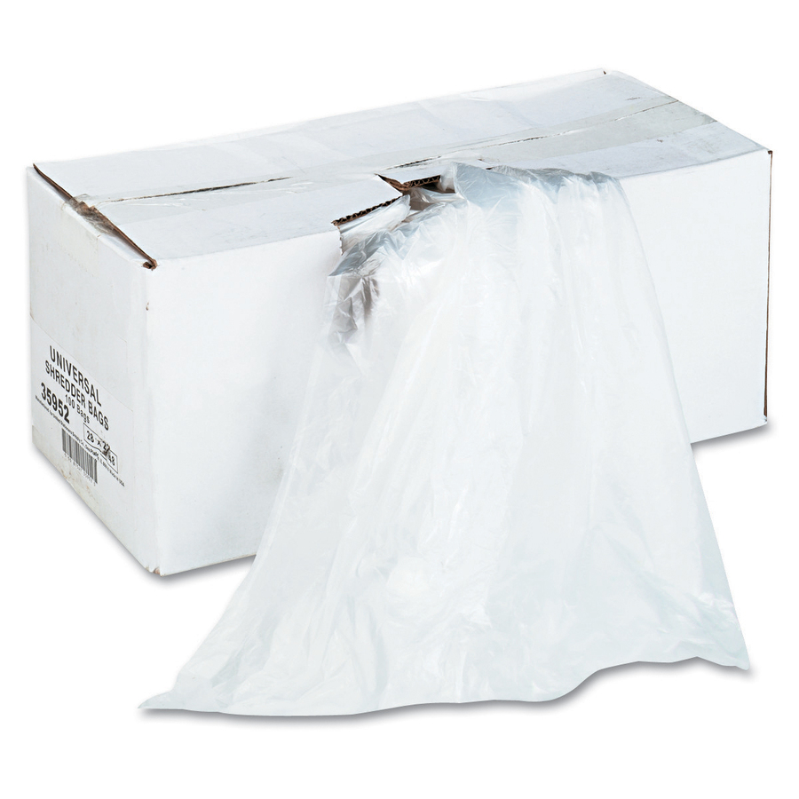 High-density polyethylene resin bags are designed for use with all size-compatible shredders. The clear, puncture-resistant bags are perforated in a continuous roll. The box opens to become a convenient dispenser. Simply open the shredder and insert the bag into the shredder cavity to collect paper and waste from the machine. The sealed bottom keeps contents inside the bag without breaking. |